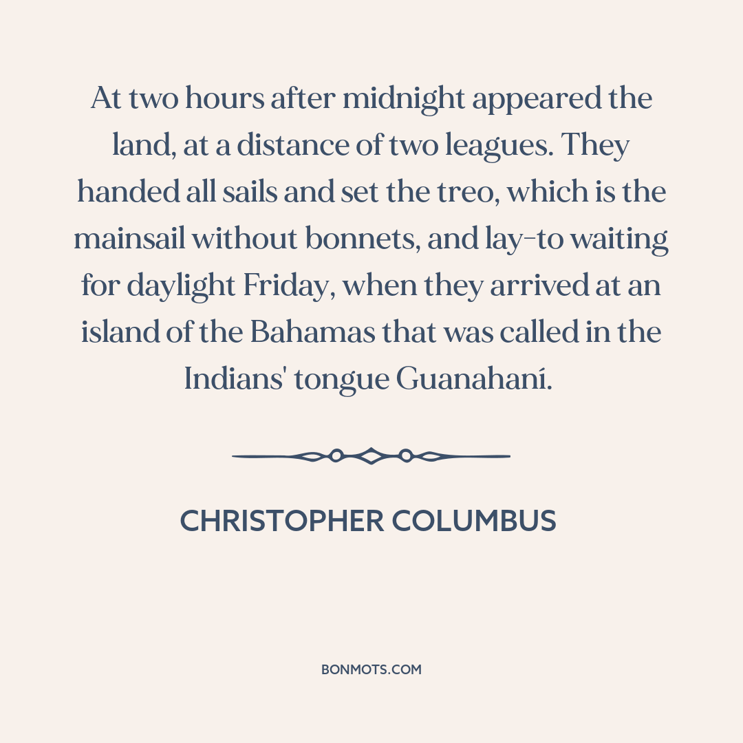 At two hours after midnight appeared the land, at a distance of two leagues. They handed all sails and set the treo, which is the mainsail without bonnets, and lay-to waiting for daylight Friday, when they arrived at an island of the Bahamas that was called in the Indians' tongue Guanahaní.