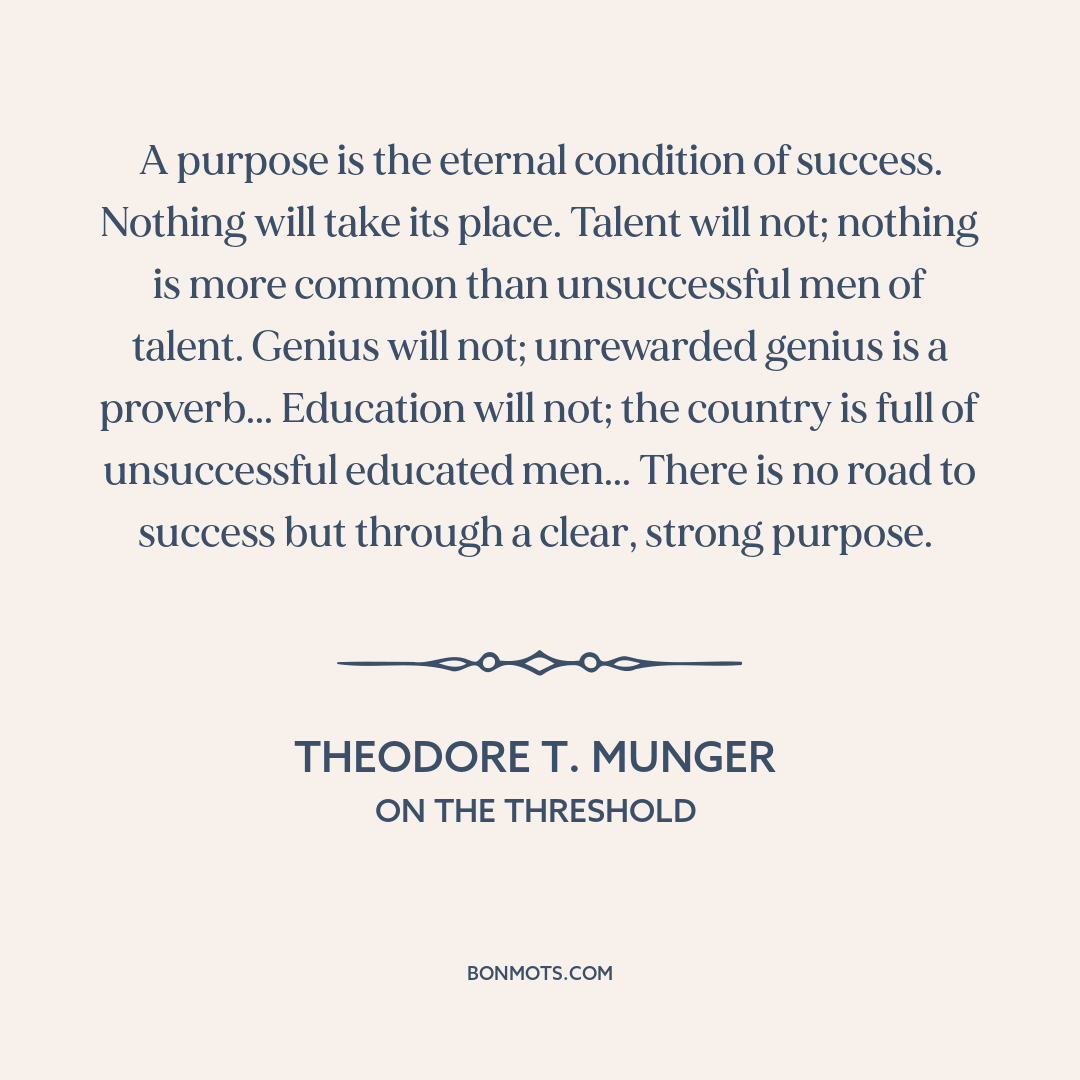 A purpose is the eternal condition of success. Nothing will take its place. Talent will not; nothing is more common than unsuccessful men of talent. Genius will not; unrewarded genius is a proverb... Education will not; the country is full of unsuccessful educated men... There is no road to success but through a clear, strong purpose.