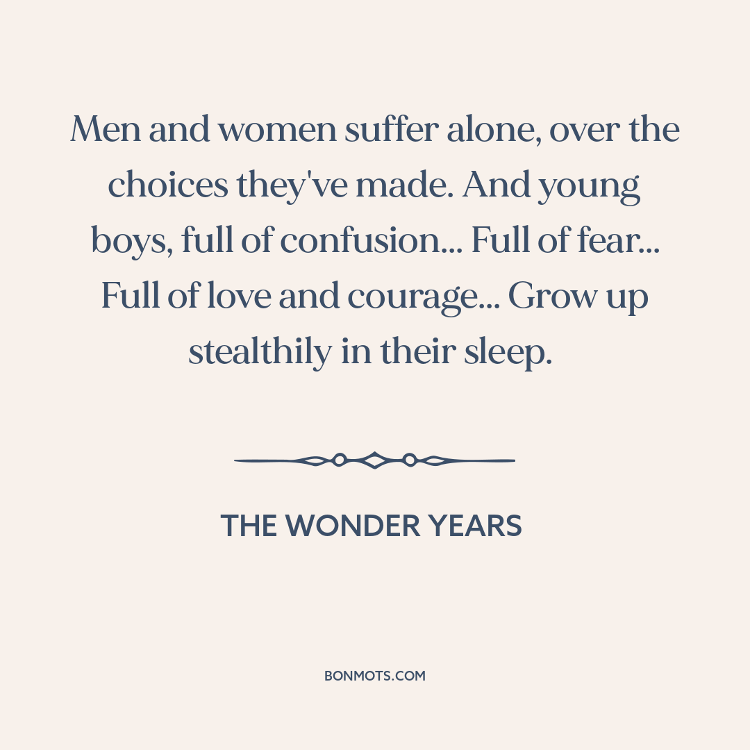 Men and women suffer alone, over the choices they've made. And young boys, full of confusion... Full of fear... Full of love and courage... Grow up stealthily in their sleep.