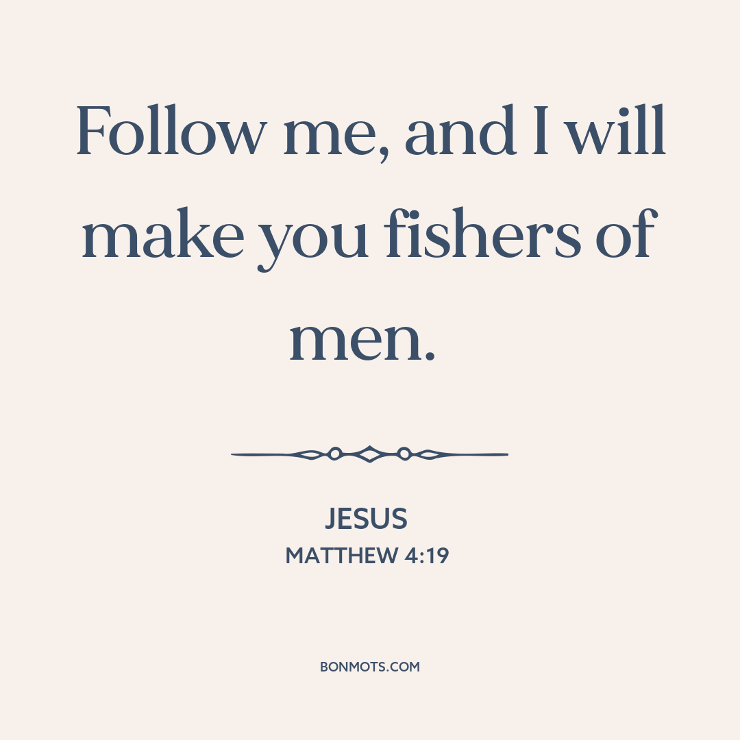 Follow me, and I will make you fishers of men. Δεῦτε ὀπίσω μου, καὶ ποιήσω ὑμᾶς ἁλεεῖς ἀνθρώπων. Jesus Matthew 4:19 Buy the Bible (KJV) at Amazon Buy the Bible (KJV) at Amazon Read this verse at Bible Hub Instagram sharing coming soon. Quote text and source copied to clipboard. Link to this quote copied to clipboard. More information about this quote Topic Following Jesus Evangelism Speaker Jesus Source Gospel of Matthew The Bible Medium Scripture Genre Religious literature Language Greek Time 60 60s 1st century Era Classical antiquity Occupation Founder of a religion Religious leader From Israel Middle East Roman Empire Authentication Score 3 More information on Authentication Score coming soon. Citation The Holy Bible: The King James Version. 1611. (Matthew 4:19). Citation text copied to clipboard.