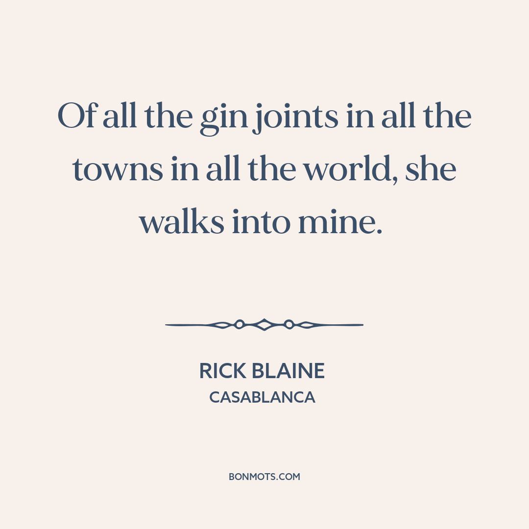 Of all the gin joints in all the towns in all the world, she walks into mine. Rick Blaine Casablanca Watch Casablanca at Amazon Watch Casablanca at Amazon Instagram sharing coming soon. Quote text and source copied to clipboard. Link to this quote copied to clipboard. More information about this quote Topic Coincidence Speaker Rick Blaine Actor Humphrey Bogart Source Casablanca Medium Film Genre Romantic drama (film) Romantic drama Language English Time 1942 1940s 20th century Authentication Score 3 More information on Authentication Score coming soon. Citation Casablanca. Directed by Michael Curtiz, Warner Bros. Pictures, 1942. Citation text copied to clipboard.