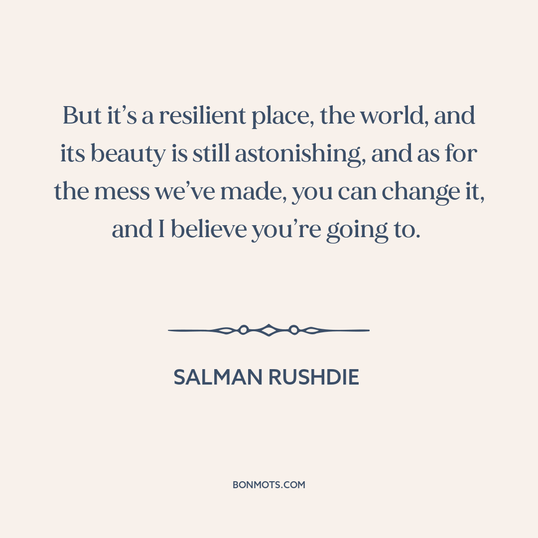 But it’s a resilient place, the world, and its beauty is still astonishing, and as for the mess we’ve made, you can change it, and I believe you’re going to.