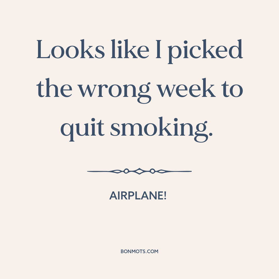Looks like I picked the wrong week to quit smoking. Airplane! Watch Airplane! at Amazon Watch Airplane! at Amazon Instagram sharing coming soon. Quote text and source copied to clipboard. Link to this quote copied to clipboard. More information about this quote Topic Stress Smoking Speaker Steve McCroskey Actor Lloyd Bridges Source Airplane! Medium Film Genre Comedy (film) Comedy Language English Time 1980 1980s 20th century Authentication Score 3 More information on Authentication Score coming soon. Citation Airplane! Directed by Jim Abrahams, David Zucker, and Jerry Zucker. Paramount Pictures/Howard W. Koch Productions, 1980. Citation text copied to clipboard.