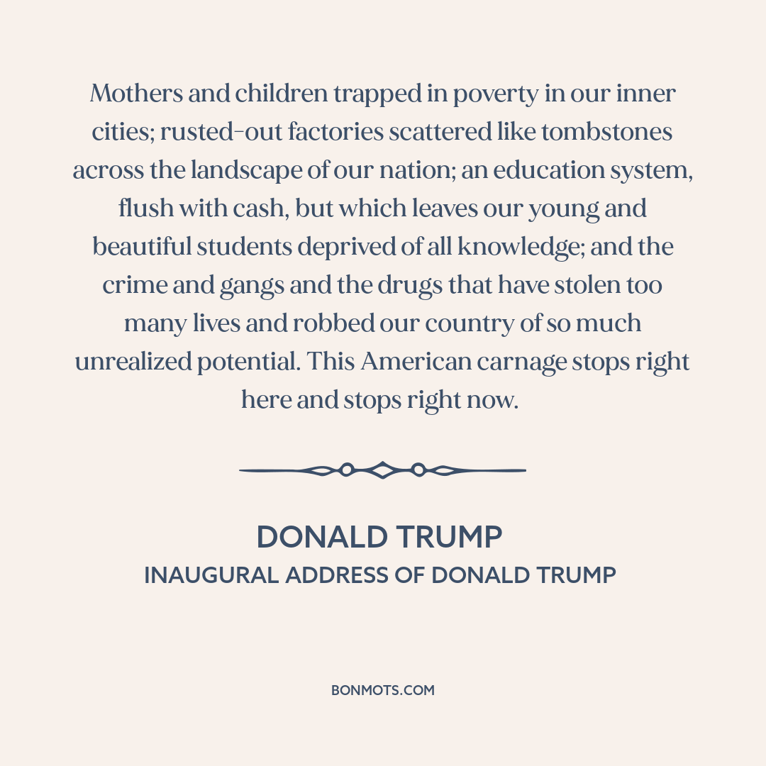 Mothers and children trapped in poverty in our inner cities; rusted-out factories scattered like tombstones across the landscape of our nation; an education system, flush with cash, but which leaves our young and beautiful students deprived of all knowledge; and the crime and gangs and the drugs that have stolen too many lives and robbed our country of so much unrealized potential. This American carnage stops right here and stops right now.