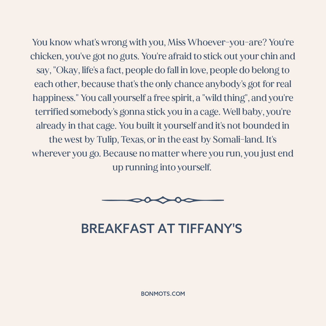 You know what's wrong with you, Miss Whoever-you-are? You're chicken, you've got no guts. You're afraid to stick out your chin and say, "Okay, life's a fact, people do fall in love, people do belong to each other, because that's the only chance anybody's got for real happiness." You call yourself a free spirit, a "wild thing", and you're terrified somebody's gonna stick you in a cage. Well baby, you're already in that cage. You built it yourself and it's not bounded in the west by Tulip, Texas, or in the east by Somali-land. It's wherever you go. Because no matter where you run, you just end up running into yourself.