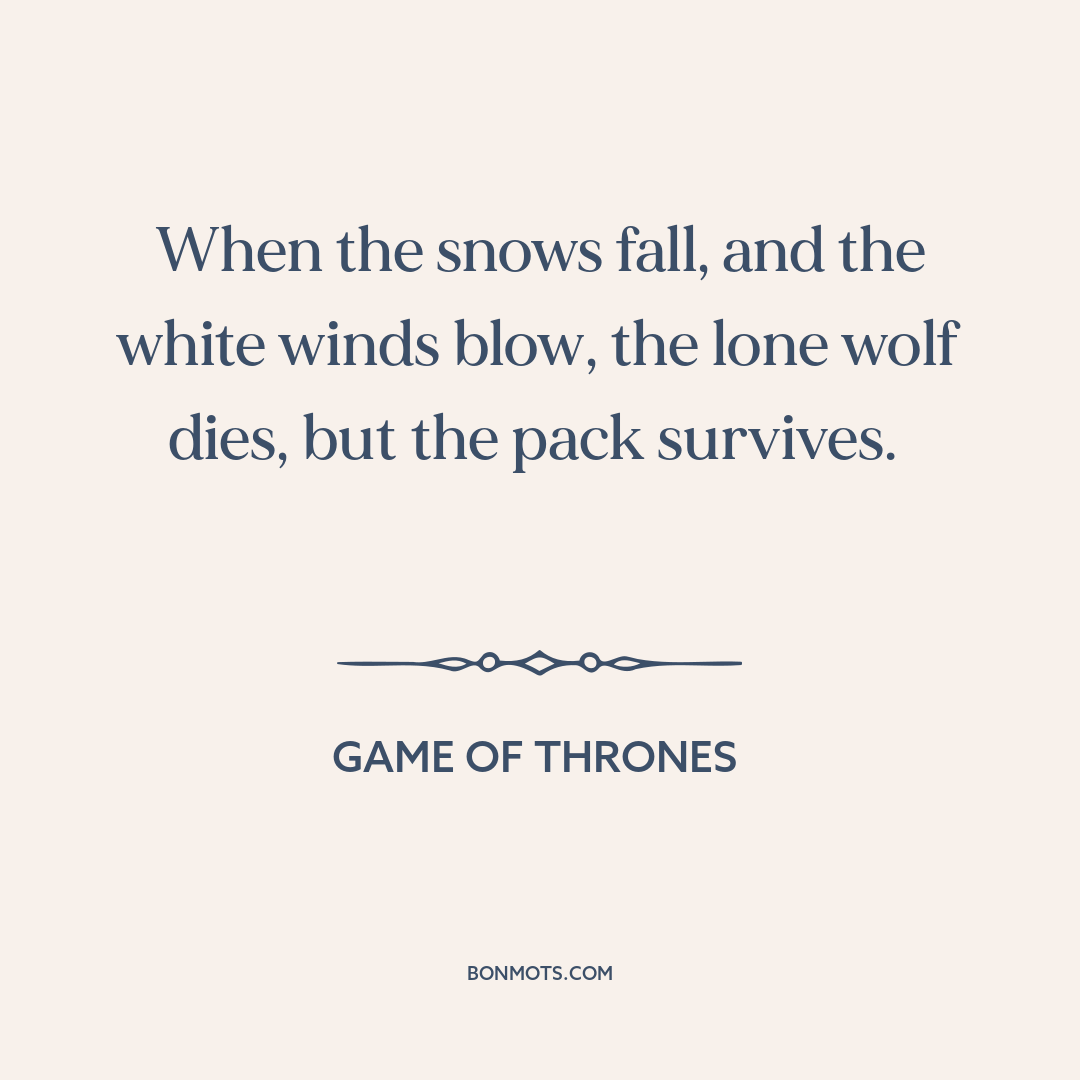 When the snows fall, and the white winds blow, the lone wolf dies, but the pack survives.