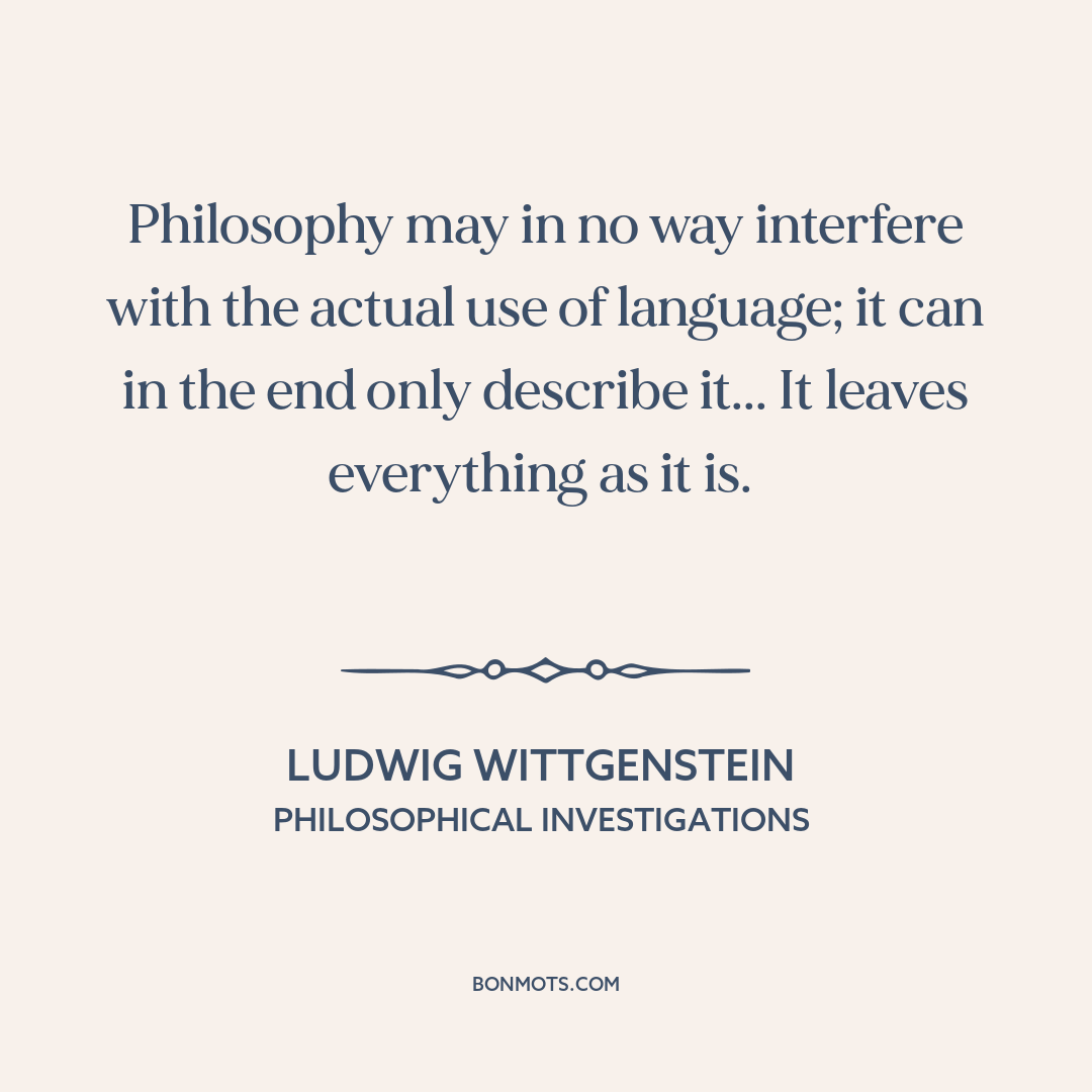 Philosophy may in no way interfere with the actual use of language; it can in the end only describe it... It leaves everything as it is.