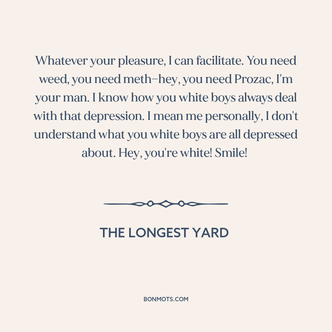 Whatever your pleasure, I can facilitate. You need weed, you need meth—hey, you need Prozac, I'm your man. I know how you white boys always deal with that depression. I mean me personally, I don't understand what you white boys are all depressed about. Hey, you're white! Smile!