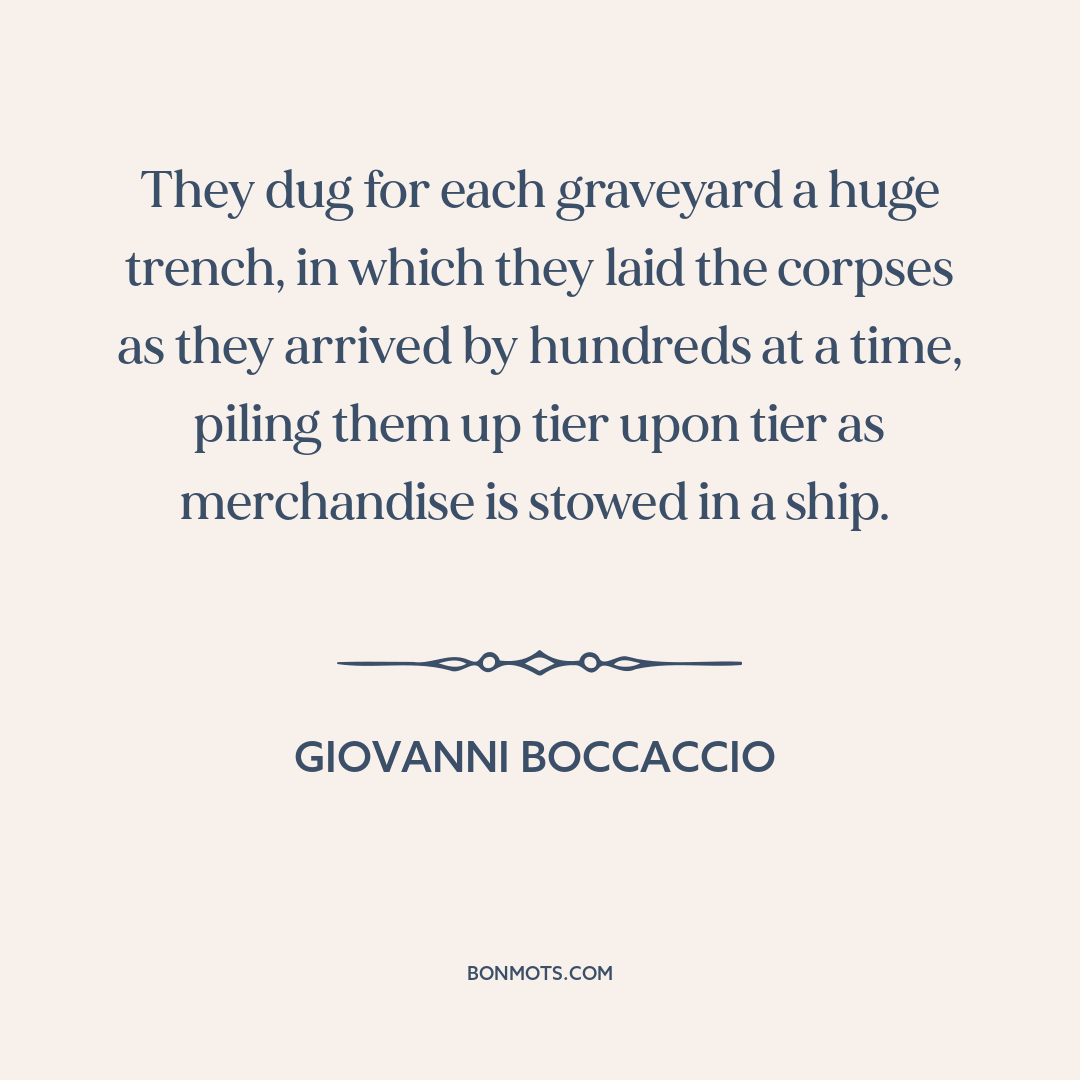 They dug for each graveyard a huge trench, in which they laid the corpses as they arrived by hundreds at a time, piling them up tier upon tier as merchandise is stowed in a ship.