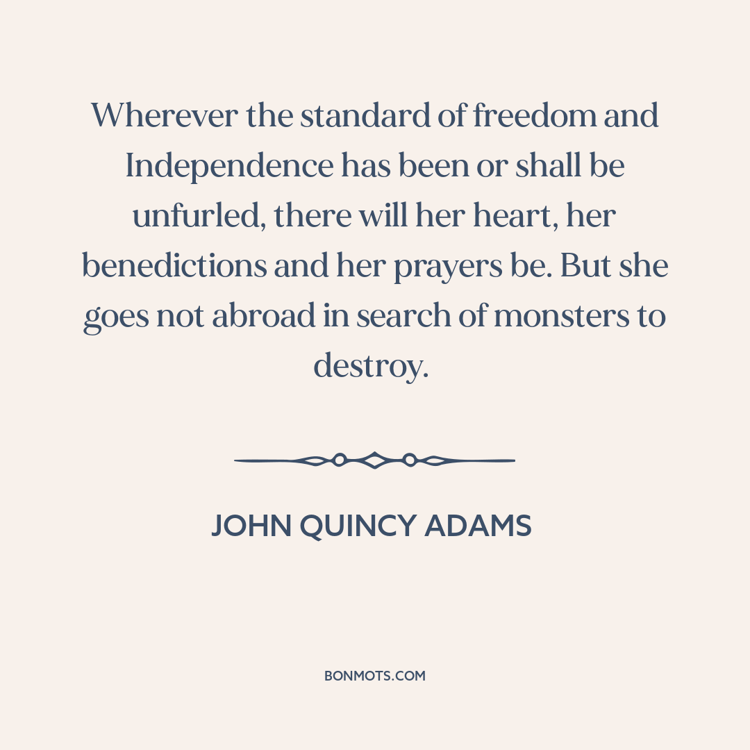 Wherever the standard of freedom and Independence has been or shall be unfurled, there will her heart, her benedictions and her prayers be. But she goes not abroad in search of monsters to destroy.