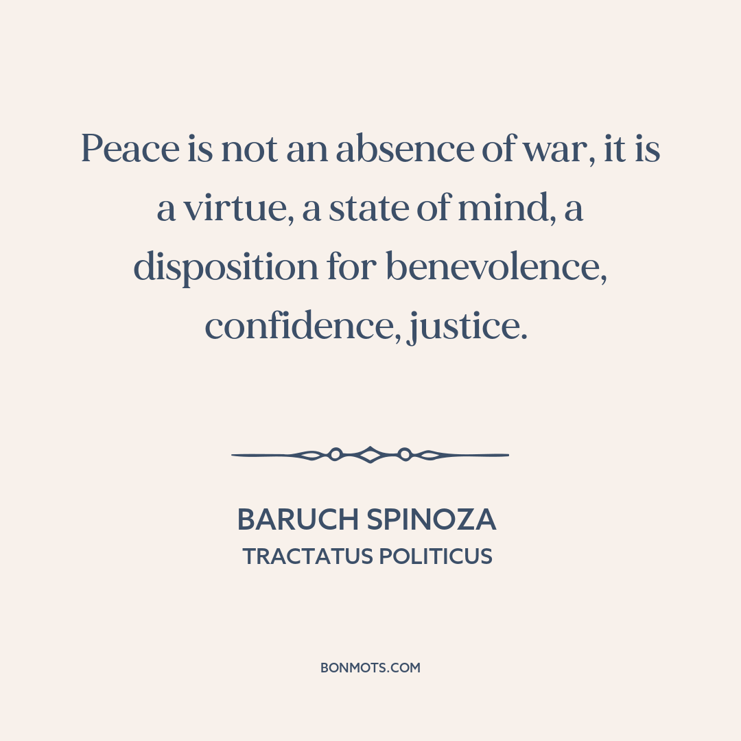 Peace is not an absence of war, it is a virtue, a state of mind, a disposition for benevolence, confidence, justice.