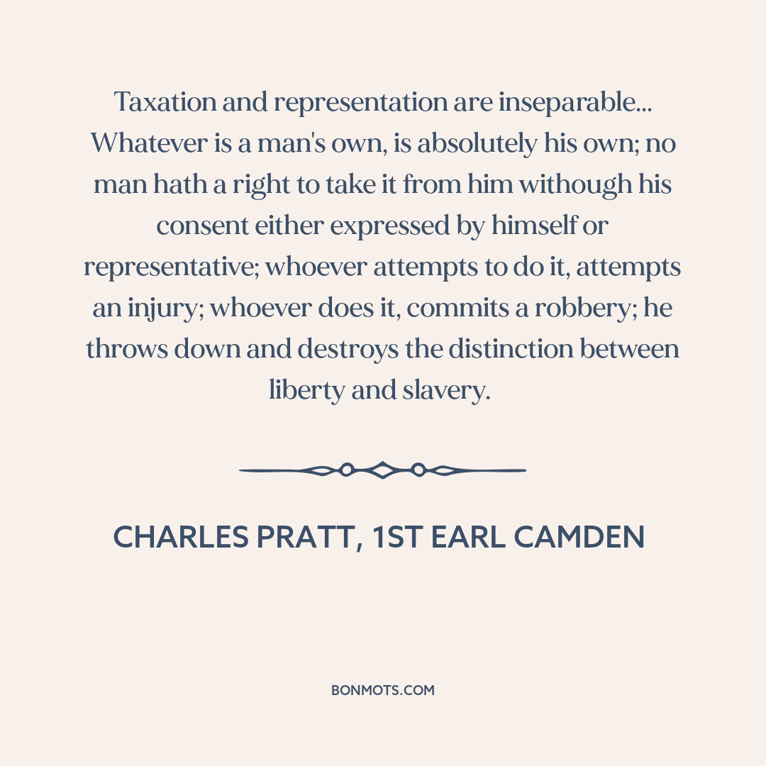 Taxation and representation are inseparable... Whatever is a man's own, is absolutely his own; no man hath a right to take it from him withough his consent either expressed by himself or representative; whoever attempts to do it, attempts an injury; whoever does it, commits a robbery; he throws down and destroys the distinction between liberty and slavery.