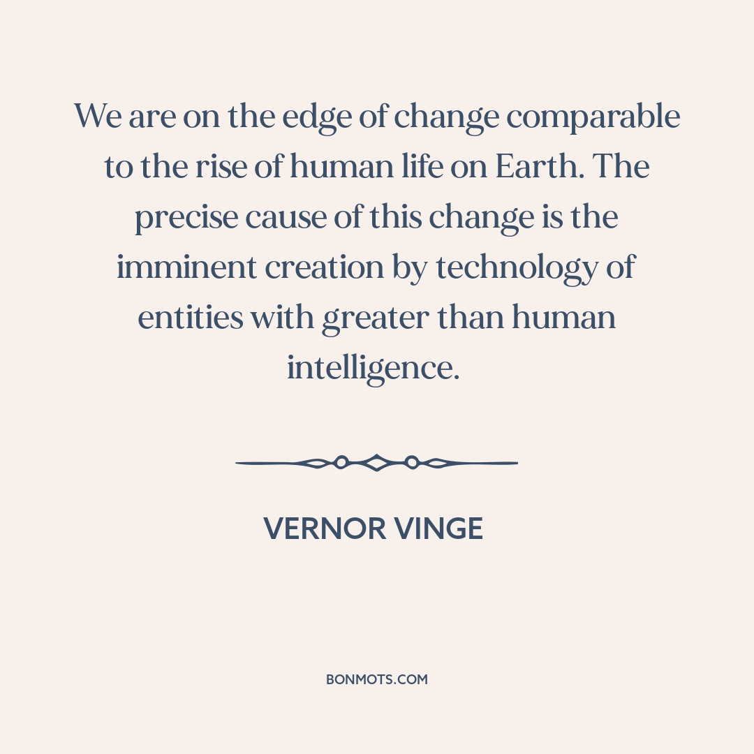 We are on the edge of change comparable to the rise of human life on Earth. The precise cause of this change is the imminent creation by technology of entities with greater than human intelligence.