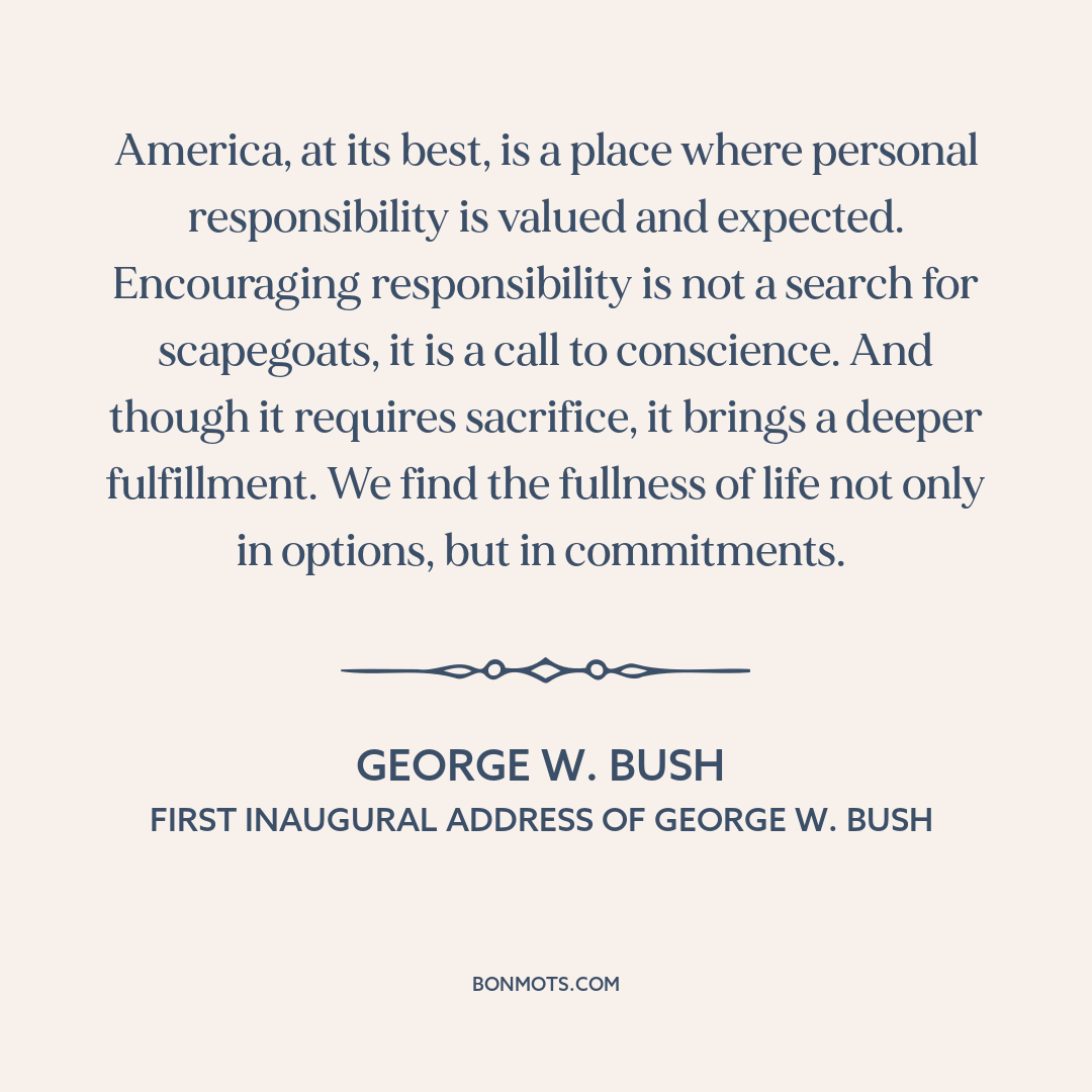 America, at its best, is a place where personal responsibility is valued and expected. Encouraging responsibility is not a search for scapegoats, it is a call to conscience. And though it requires sacrifice, it brings a deeper fulfillment. We find the fullness of life not only in options, but in commitments.