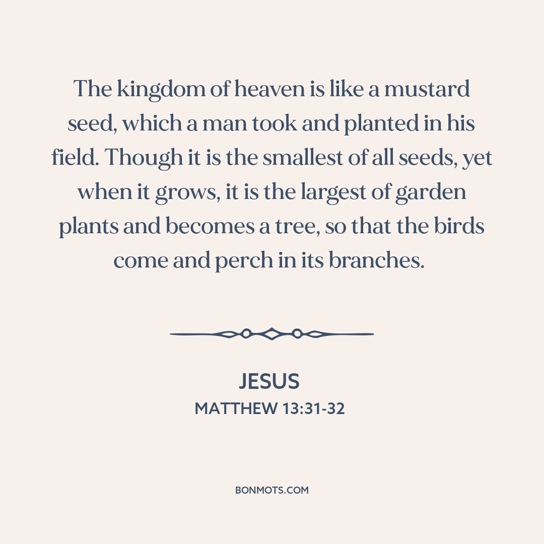 The kingdom of heaven is like a mustard seed, which a man took and planted in his field. Though it is the smallest of all seeds, yet when it grows, it is the largest of garden plants and becomes a tree, so that the birds come and perch in its branches.