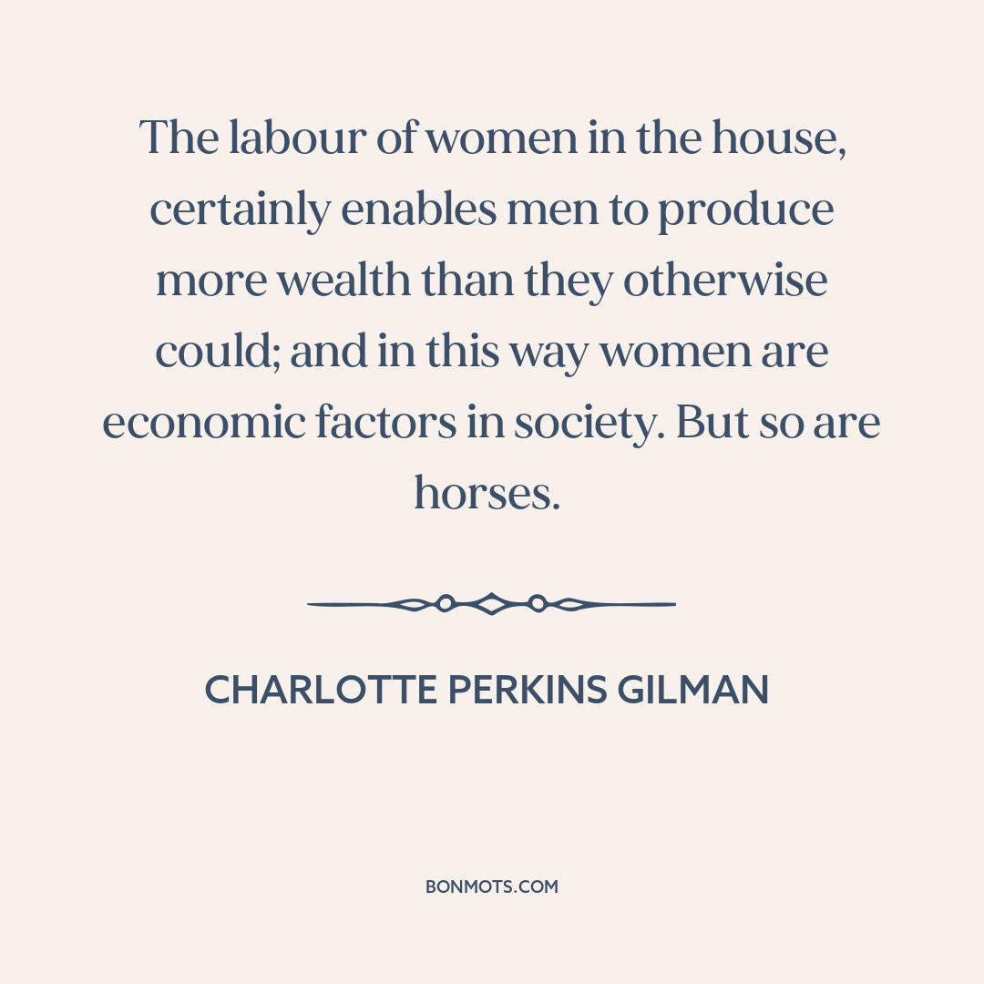 The labour of women in the house, certainly enables men to produce more wealth than they otherwise could; and in this way women are economic factors in society. But so are horses.