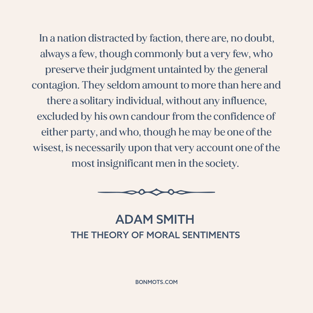 In a nation distracted by faction, there are, no doubt, always a few, though commonly but a very few, who preserve their judgment untainted by the general contagion. They seldom amount to more than here and there a solitary individual, without any influence, excluded by his own candour from the confidence of either party, and who, though he may be one of the wisest, is necessarily upon that very account one of the most insignificant men in the society.