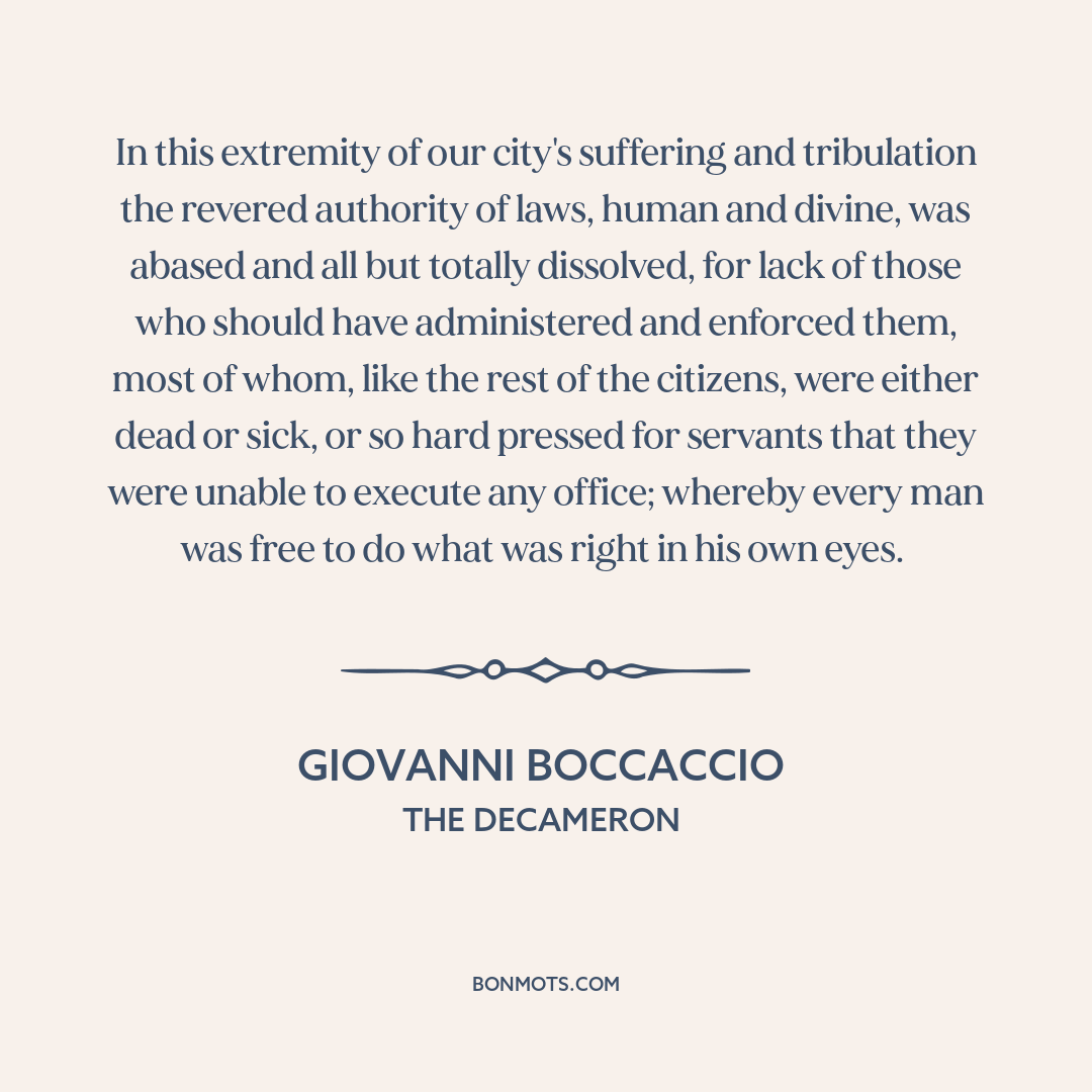 In this extremity of our city's suffering and tribulation the revered authority of laws, human and divine, was abased and all but totally dissolved, for lack of those who should have administered and enforced them, most of whom, like the rest of the citizens, were either dead or sick, or so hard pressed for servants that they were unable to execute any office; whereby every man was free to do what was right in his own eyes.