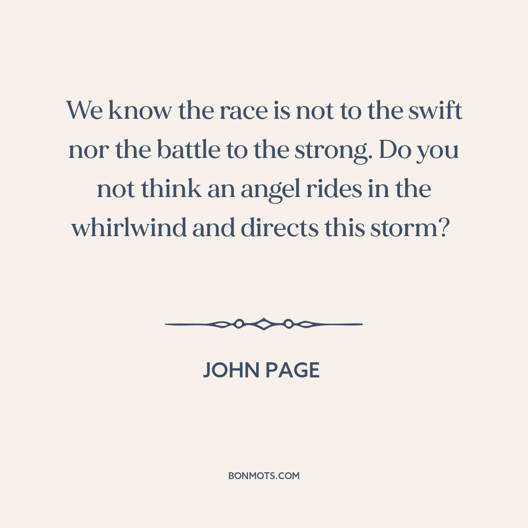 We know the race is not to the swift nor the battle to the strong. Do you not think an angel rides in the whirlwind and directs this storm?
