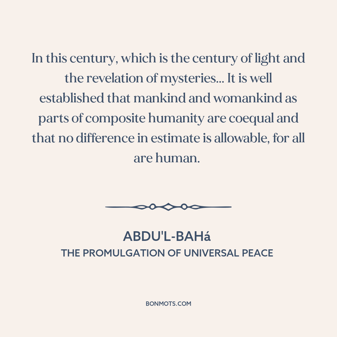 In this century, which is the century of light and the revelation of mysteries... It is well established that mankind and womankind as parts of composite humanity are coequal and that no difference in estimate is allowable, for all are human.