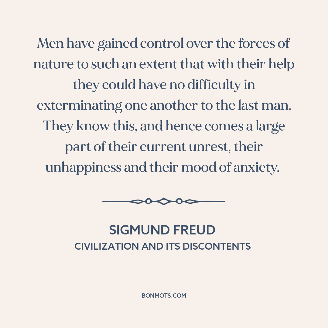 Men have gained control over the forces of nature to such an extent that with their help they could have no difficulty in exterminating one another to the last man. They know this, and hence comes a large part of their current unrest, their unhappiness and their mood of anxiety.