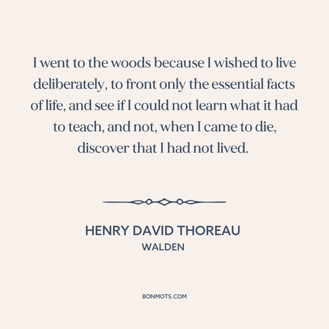 I went to the woods because I wished to live deliberately, to front only the essential facts of life, and see if I could not learn what it had to teach, and not, when I came to die, discover that I had not lived.