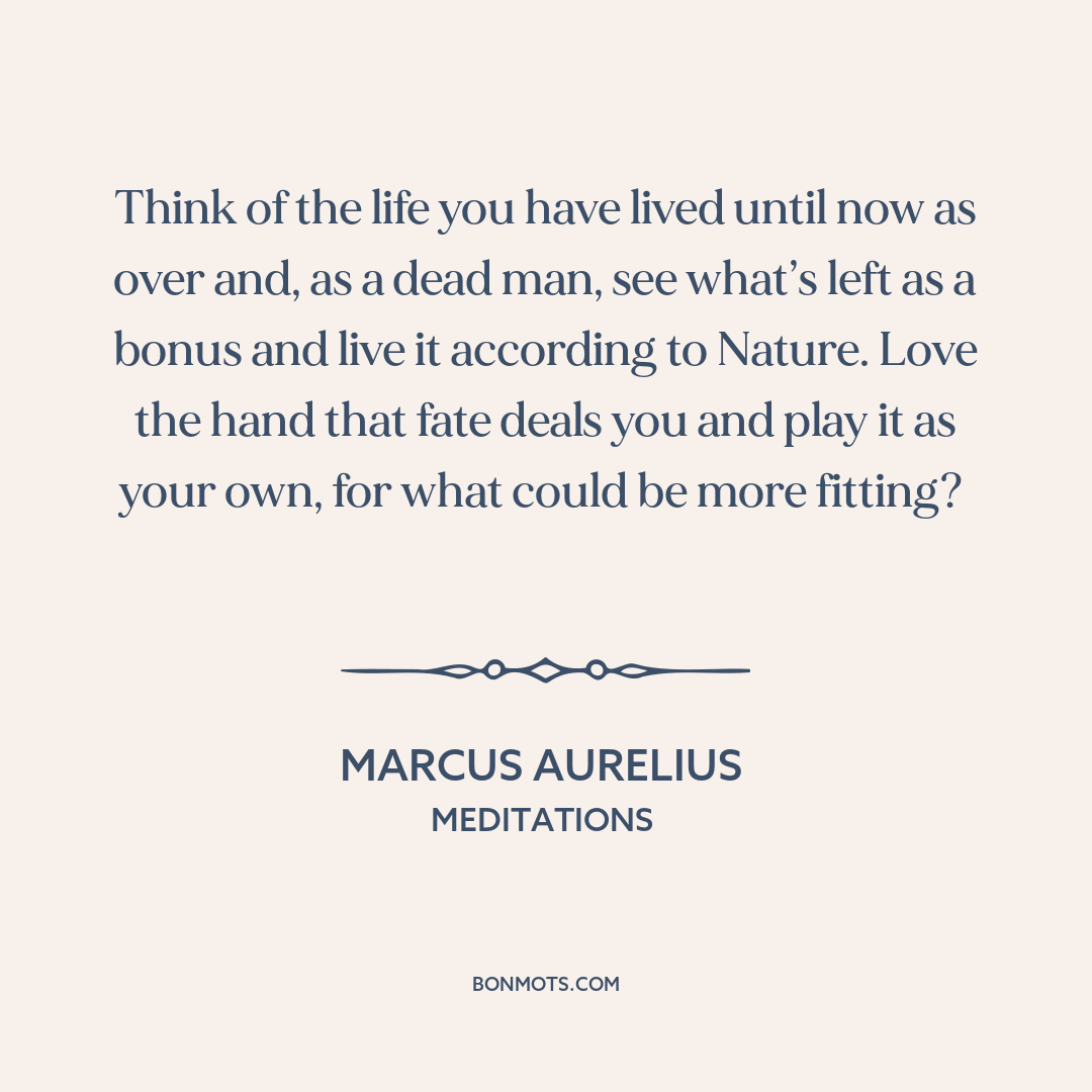 Think of the life you have lived until now as over and, as a dead man, see what’s left as a bonus and live it according to Nature. Love the hand that fate deals you and play it as your own, for what could be more fitting?