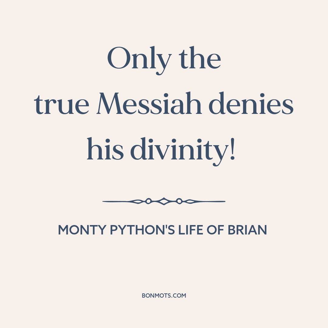 Only the true Messiah denies his divinity! Monty Python's Life of Brian Watch Monty Python's Life of Brian at Amazon Watch Monty Python's Life of Brian at Amazon Instagram sharing coming soon. Quote text and source copied to clipboard. Link to this quote copied to clipboard. More information about this quote Topic The messiah Speaker Female follower Actor Carol Cleveland Source Monty Python's Life of Brian Medium Film Genre Comedy (film) Comedy Statement Type Nonfalsifiable statement Language English Time 1979 1970s 20th century Authentication Score 3 More information on Authentication Score coming soon. Citation Monty Python's Life of Brian. Directed by Terry Jones, Handmade Films/Python (Monty) Pictures, 1979. Citation text copied to clipboard.