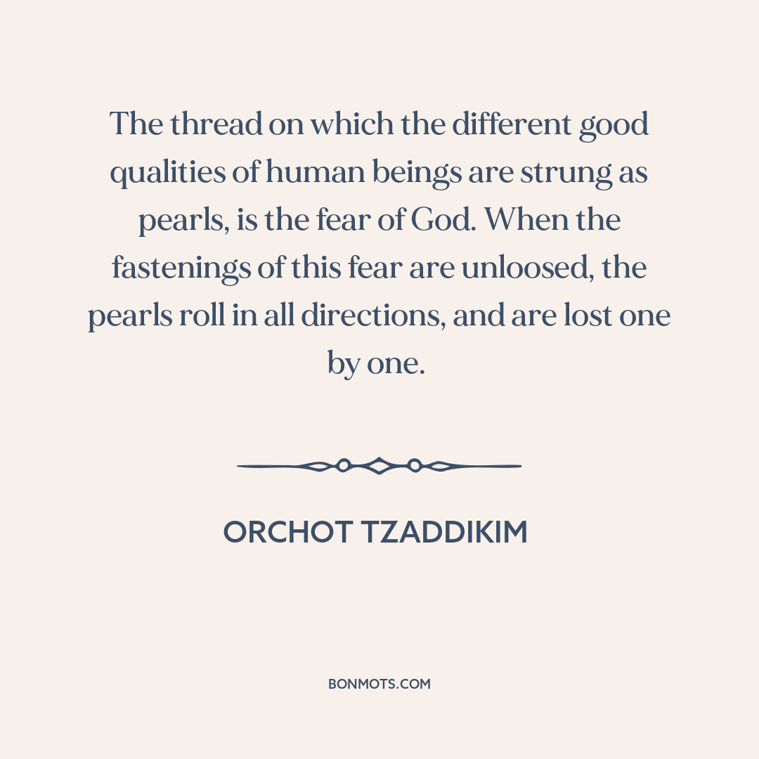 The thread on which the different good qualities of human beings are strung as pearls, is the fear of God. When the fastenings of this fear are unloosed, the pearls roll in all directions, and are lost one by one.