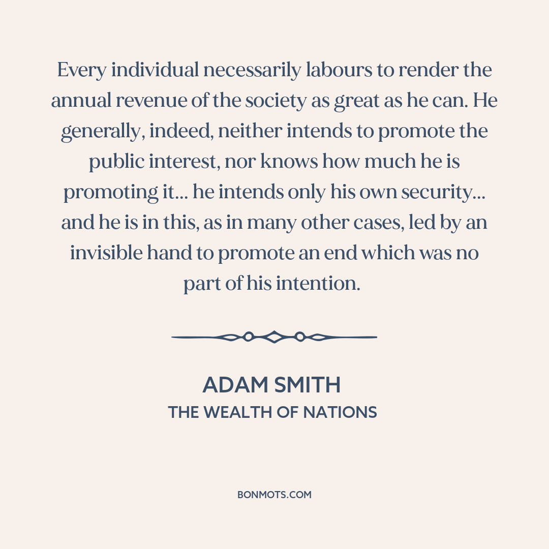 Every individual necessarily labours to render the annual revenue of the society as great as he can. He generally, indeed, neither intends to promote the public interest, nor knows how much he is promoting it... he intends only his own security... and he is in this, as in many other cases, led by an invisible hand to promote an end which was no part of his intention.