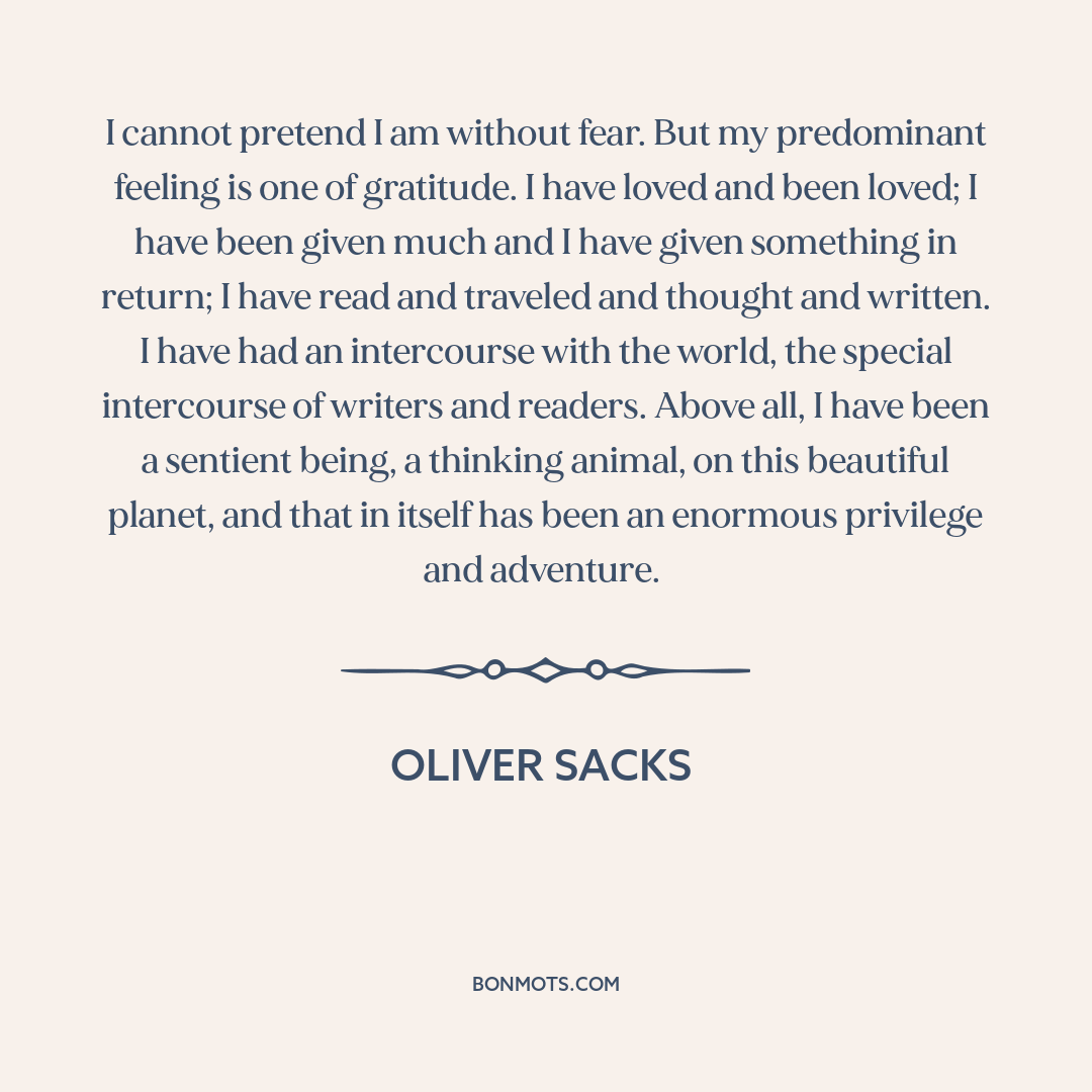 I cannot pretend I am without fear. But my predominant feeling is one of gratitude. I have loved and been loved; I have been given much and I have given something in return; I have read and traveled and thought and written. I have had an intercourse with the world, the special intercourse of writers and readers. Above all, I have been a sentient being, a thinking animal, on this beautiful planet, and that in itself has been an enormous privilege and adventure.