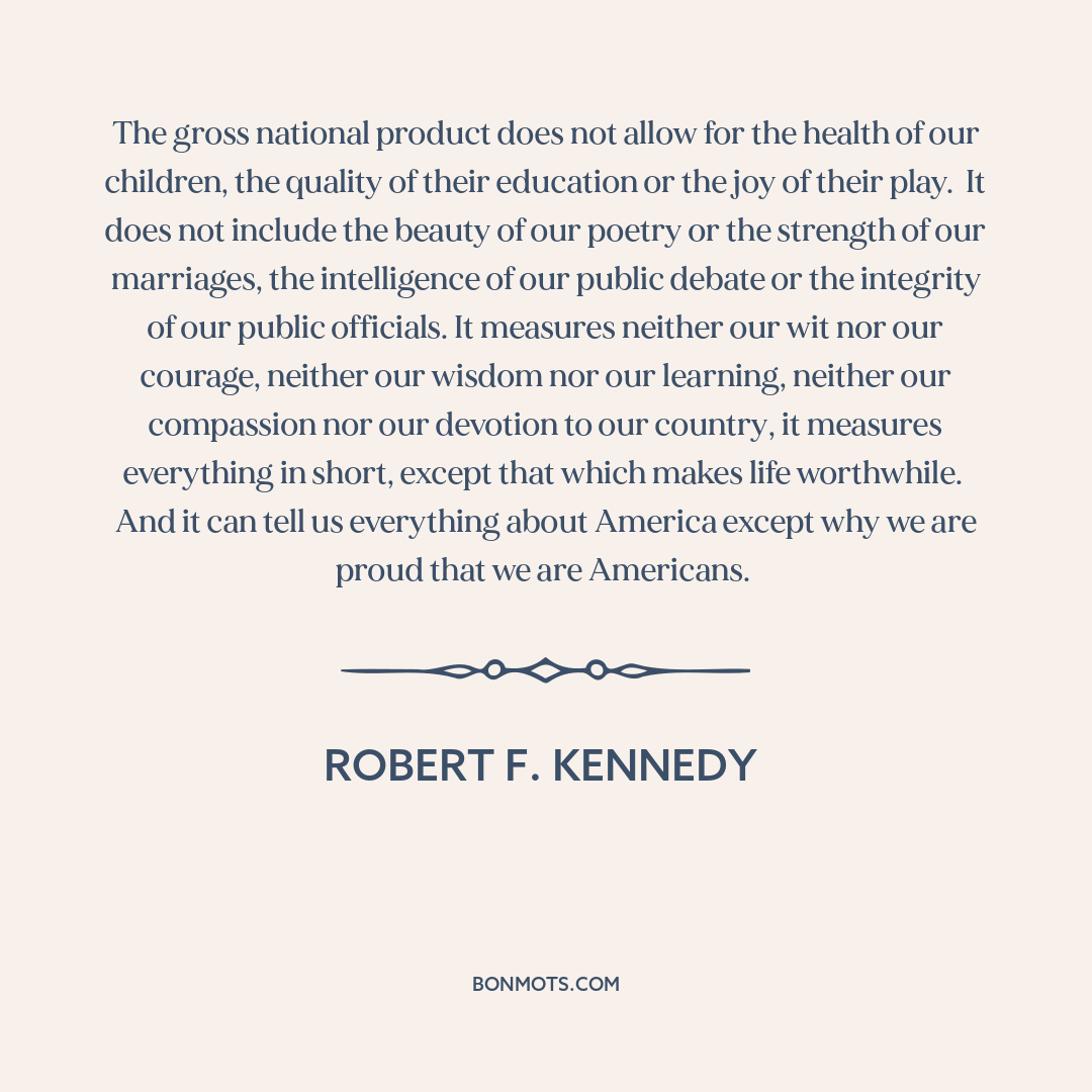 The gross national product does not allow for the health of our children, the quality of their education or the joy of their play. It does not include the beauty of our poetry or the strength of our marriages, the intelligence of our public debate or the integrity of our public officials. It measures neither our wit nor our courage, neither our wisdom nor our learning, neither our compassion nor our devotion to our country, it measures everything in short, except that which makes life worthwhile. And it can tell us everything about America except why we are proud that we are Americans.