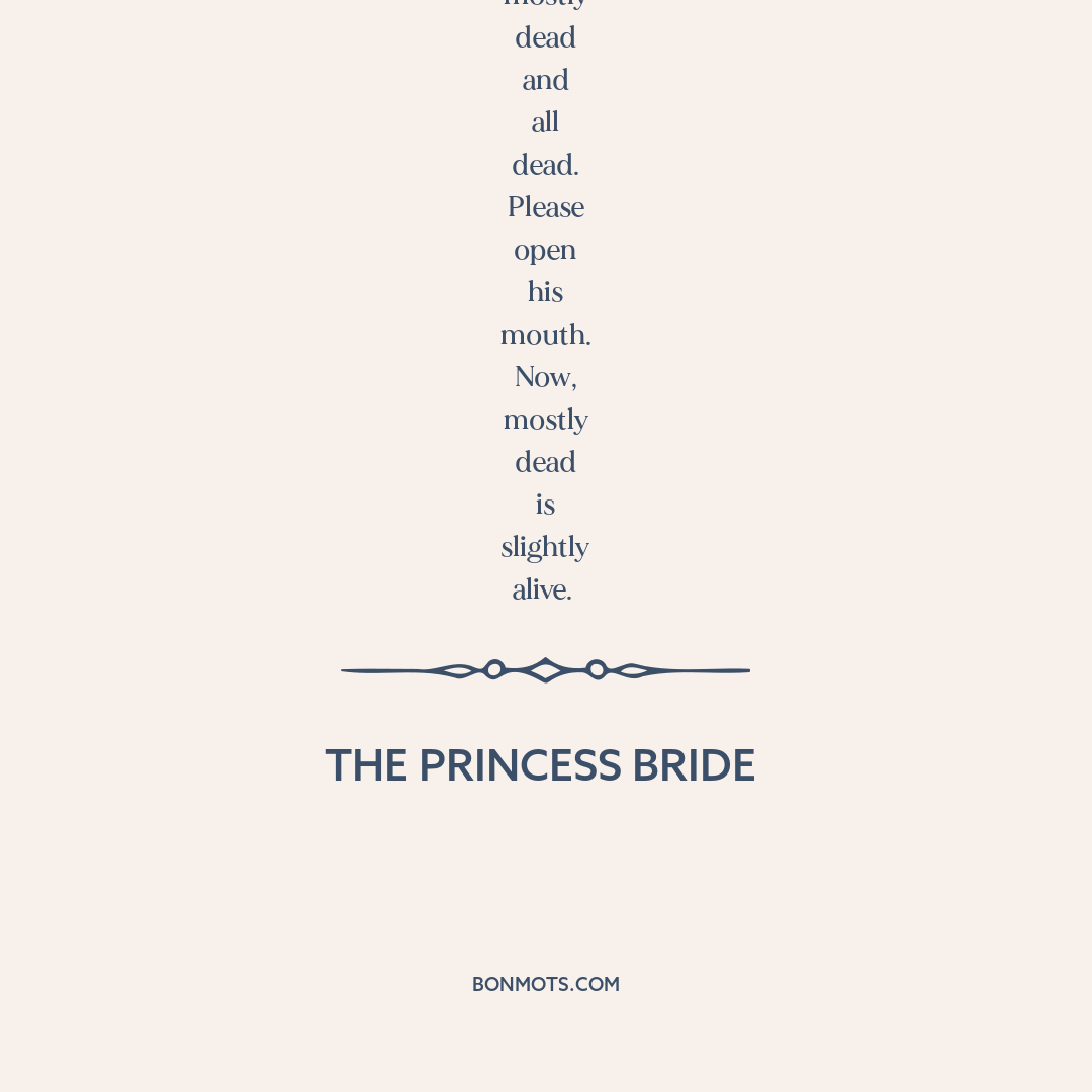 Whoo-hoo-hoo, look who knows so much. It just so happens that your friend here is only mostly dead. There's a big difference between mostly dead and all dead. Please open his mouth. Now, mostly dead is slightly alive.