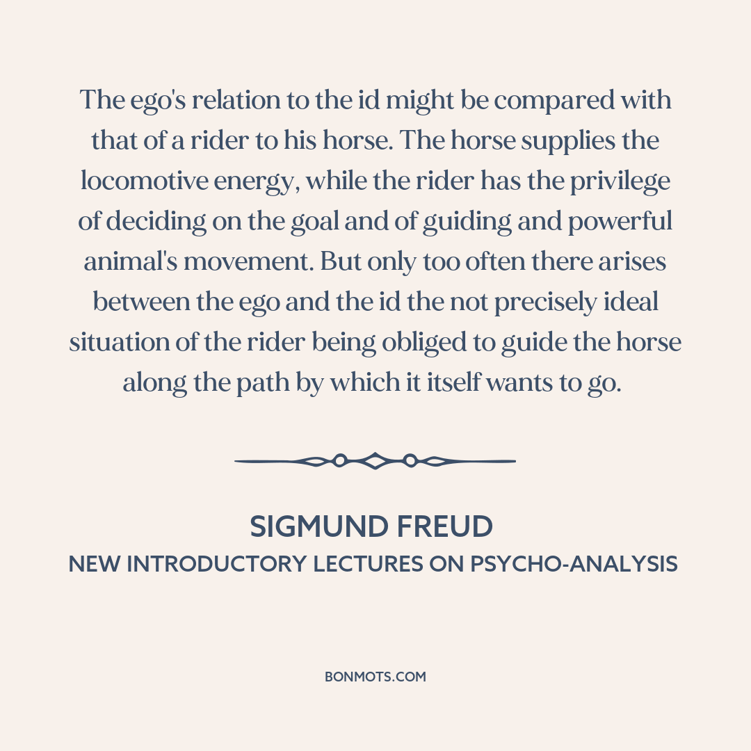 The ego's relation to the id might be compared with that of a rider to his horse. The horse supplies the locomotive energy, while the rider has the privilege of deciding on the goal and of guiding and powerful animal's movement. But only too often there arises between the ego and the id the not precisely ideal situation of the rider being obliged to guide the horse along the path by which it itself wants to go.