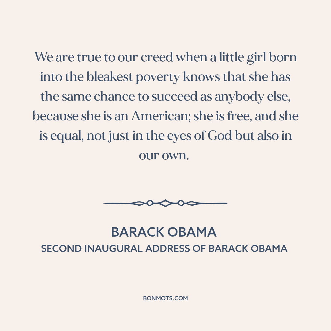 We are true to our creed when a little girl born into the bleakest poverty knows that she has the same chance to succeed as anybody else, because she is an American; she is free, and she is equal, not just in the eyes of God but also in our own.