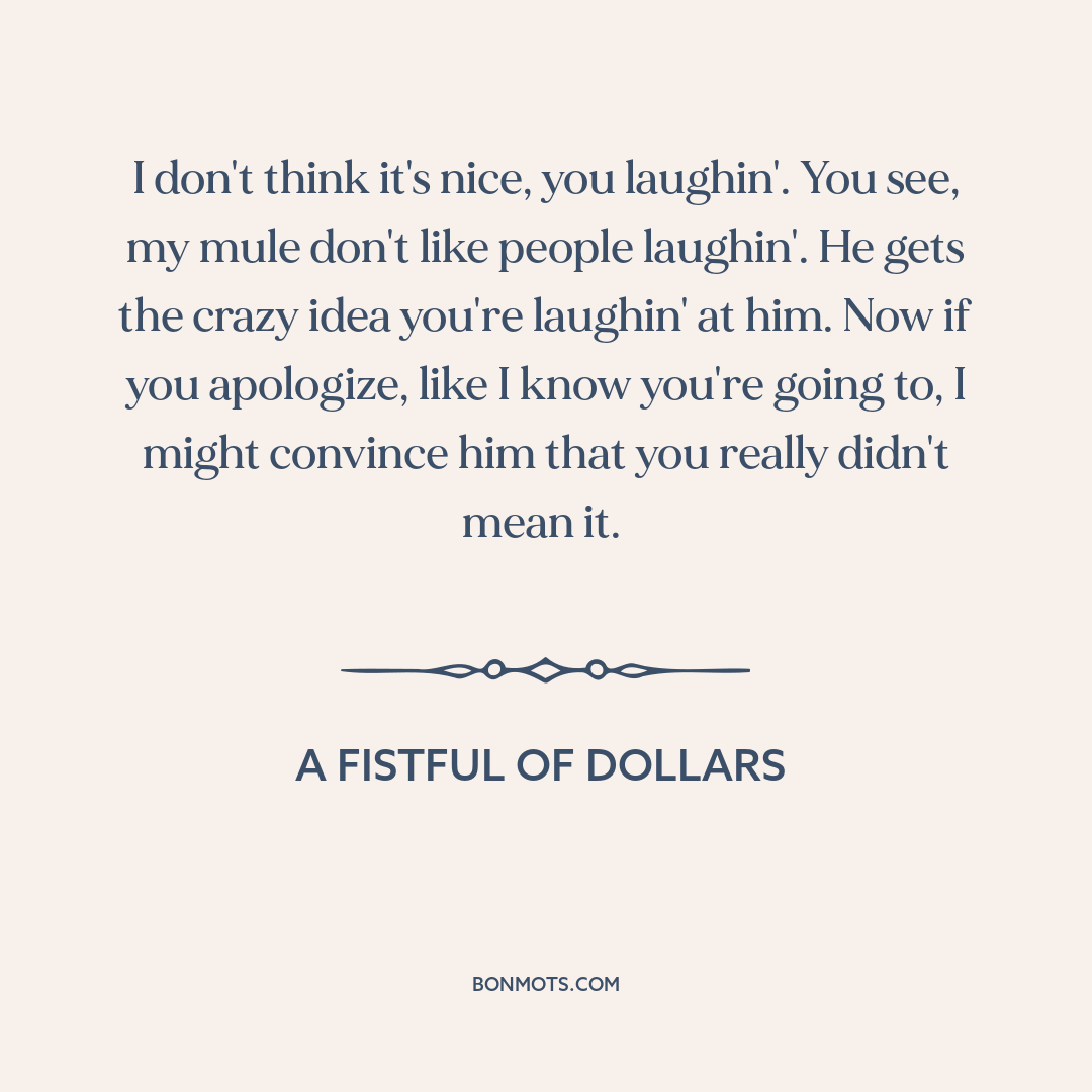 I don't think it's nice, you laughin'. You see, my mule don't like people laughin'. He gets the crazy idea you're laughin' at him. Now if you apologize, like I know you're going to, I might convince him that you really didn't mean it.