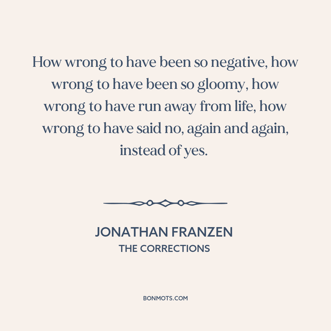 How wrong to have been so negative, how wrong to have been so gloomy, how wrong to have run away from life, how wrong to have said no, again and again, instead of yes.