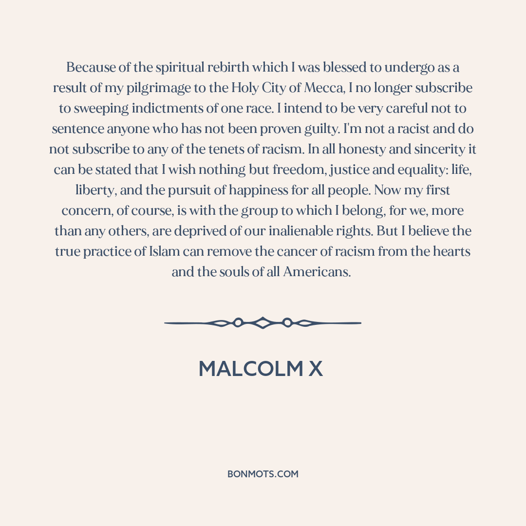 Because of the spiritual rebirth which I was blessed to undergo as a result of my pilgrimage to the Holy City of Mecca, I no longer subscribe to sweeping indictments of one race. I intend to be very careful not to sentence anyone who has not been proven guilty. I'm not a racist and do not subscribe to any of the tenets of racism. In all honesty and sincerity it can be stated that I wish nothing but freedom, justice and equality: life, liberty, and the pursuit of happiness for all people. Now my first concern, of course, is with the group to which I belong, for we, more than any others, are deprived of our inalienable rights. But I believe the true practice of Islam can remove the cancer of racism from the hearts and the souls of all Americans.