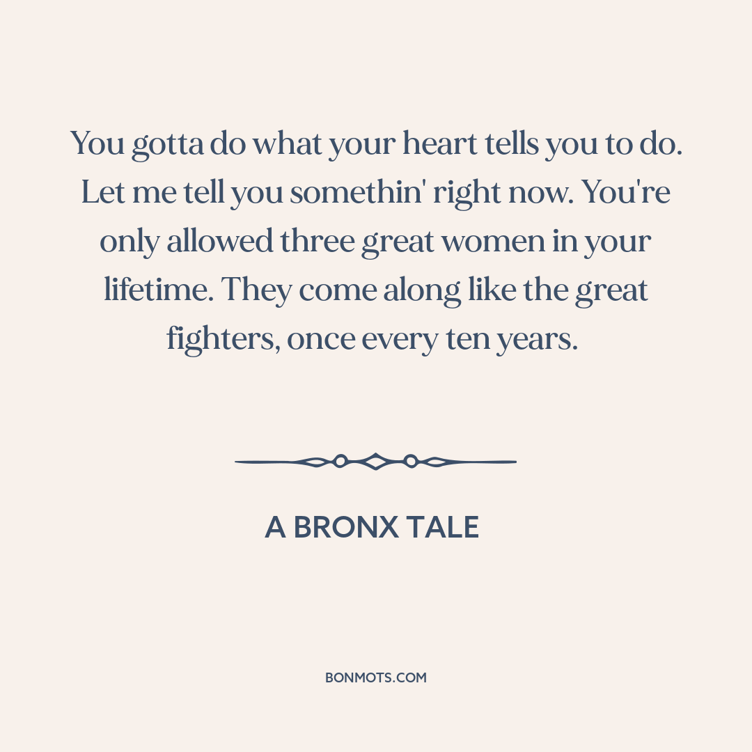 You gotta do what your heart tells you to do. Let me tell you somethin' right now. You're only allowed three great women in your lifetime. They come along like the great fighters, once every ten years.