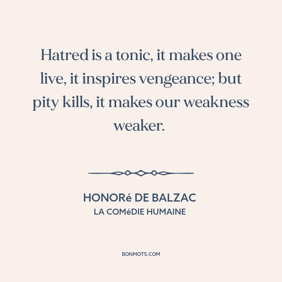 Hatred is a tonic, it makes one live, it inspires vengeance; but pity kills, it makes our weakness weaker.