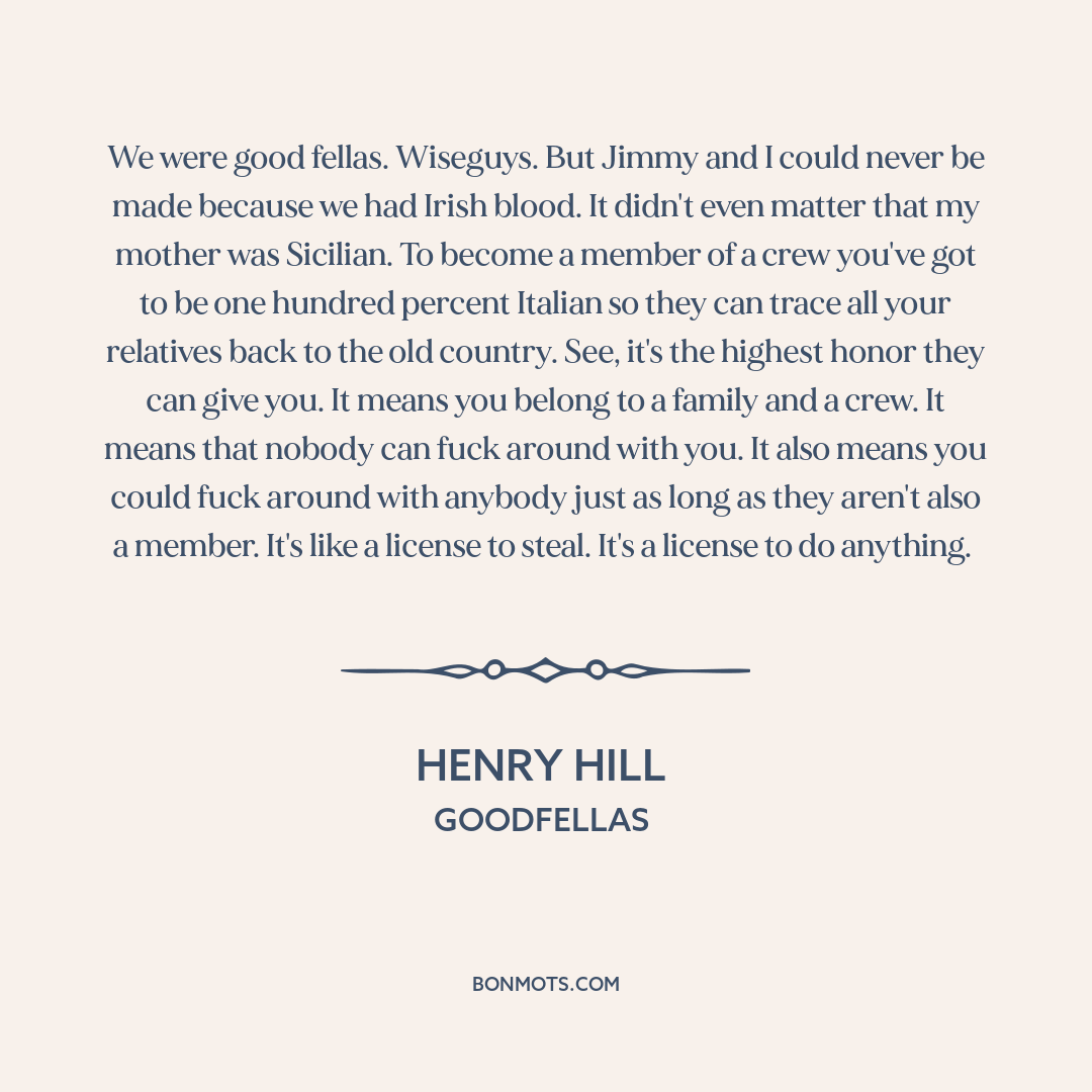 We were good fellas. Wiseguys. But Jimmy and I could never be made because we had Irish blood. It didn't even matter that my mother was Sicilian. To become a member of a crew you've got to be one hundred percent Italian so they can trace all your relatives back to the old country. See, it's the highest honor they can give you. It means you belong to a family and a crew. It means that nobody can fuck around with you. It also means you could fuck around with anybody just as long as they aren't also a member. It's like a license to steal. It's a license to do anything.