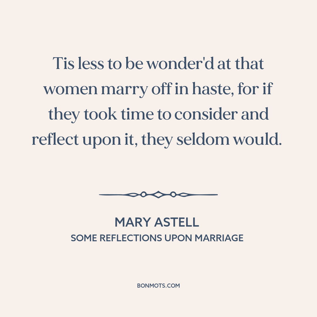 Tis less to be wonder'd at that women marry off in haste, for if they took time to consider and reflect upon it, they seldom would.