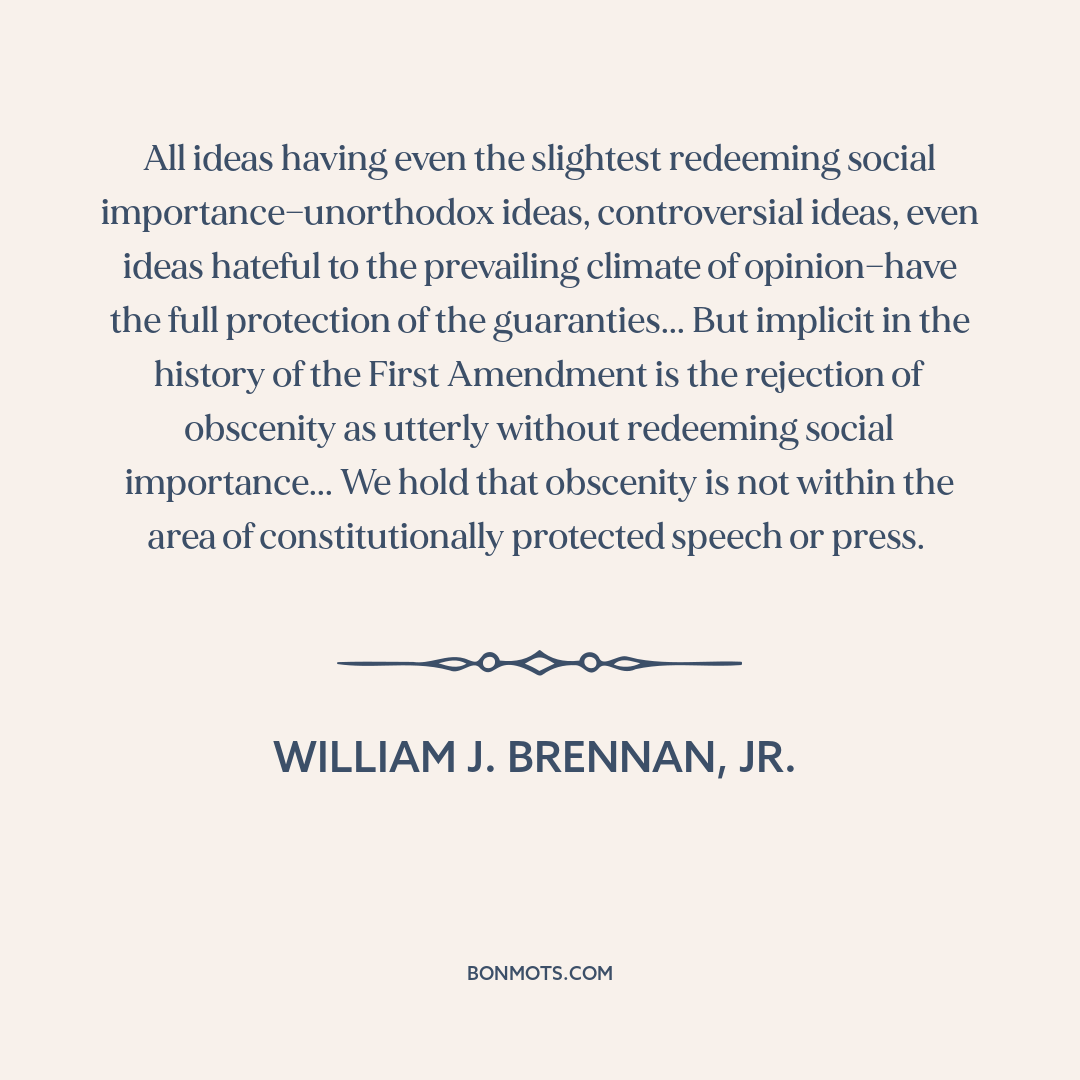 All ideas having even the slightest redeeming social importance—unorthodox ideas, controversial ideas, even ideas hateful to the prevailing climate of opinion—have the full protection of the guaranties... But implicit in the history of the First Amendment is the rejection of obscenity as utterly without redeeming social importance... We hold that obscenity is not within the area of constitutionally protected speech or press.