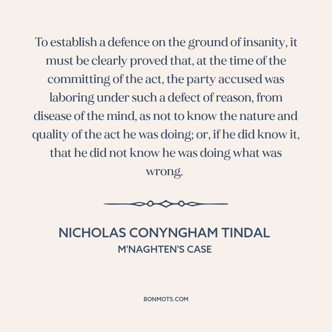 To establish a defence on the ground of insanity, it must be clearly proved that, at the time of the committing of the act, the party accused was laboring under such a defect of reason, from disease of the mind, as not to know the nature and quality of the act he was doing; or, if he did know it, that he did not know he was doing what was wrong.