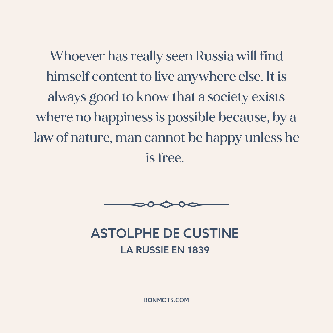 Whoever has really seen Russia will find himself content to live anywhere else. It is always good to know that a society exists where no happiness is possible because, by a law of nature, man cannot be happy unless he is free.