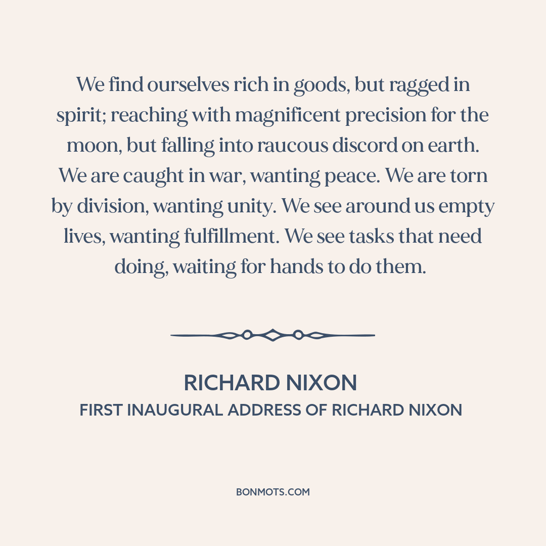 We find ourselves rich in goods, but ragged in spirit; reaching with magnificent precision for the moon, but falling into raucous discord on earth. We are caught in war, wanting peace. We are torn by division, wanting unity. We see around us empty lives, wanting fulfillment. We see tasks that need doing, waiting for hands to do them.