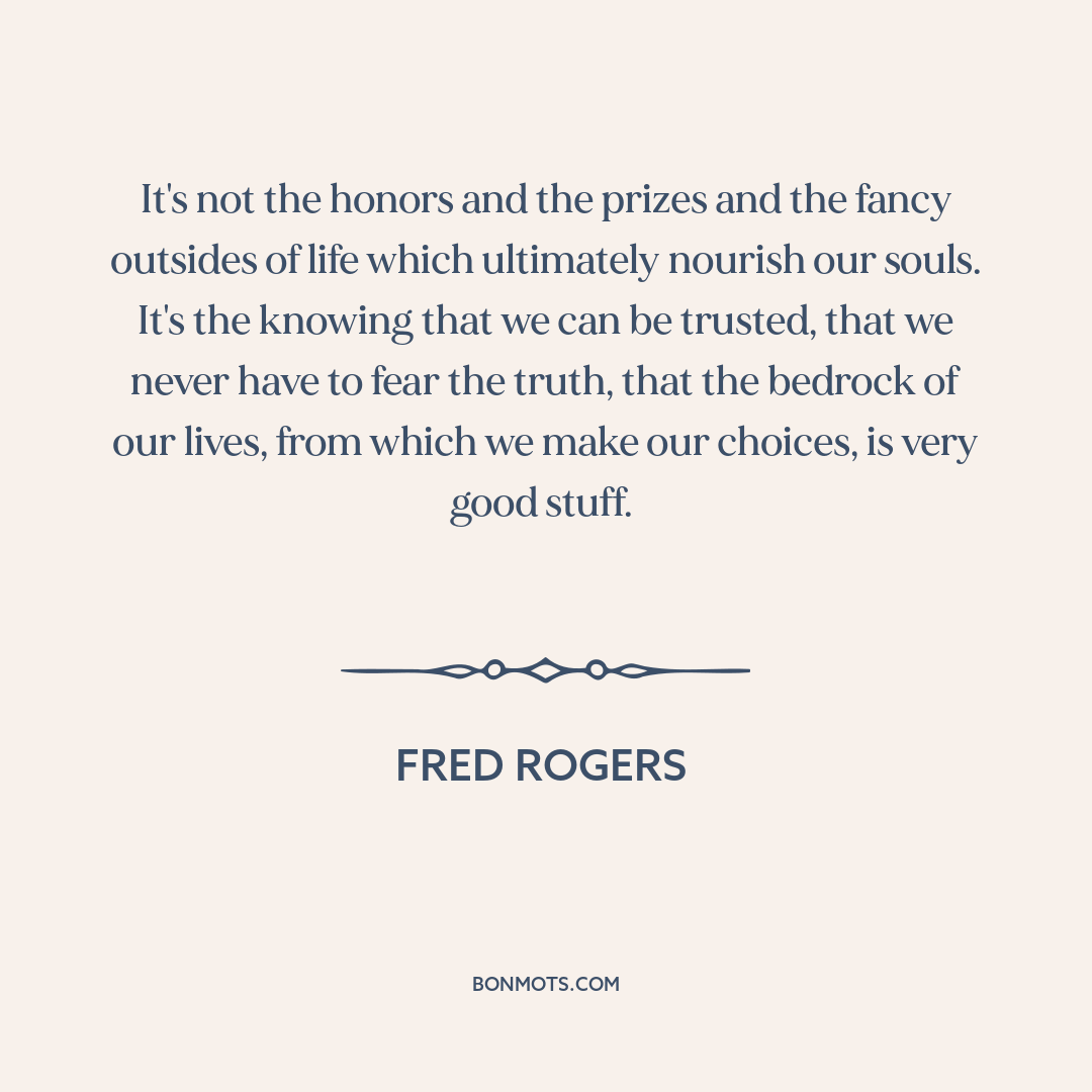 It's not the honors and the prizes and the fancy outsides of life which ultimately nourish our souls. It's the knowing that we can be trusted, that we never have to fear the truth, that the bedrock of our lives, from which we make our choices, is very good stuff.