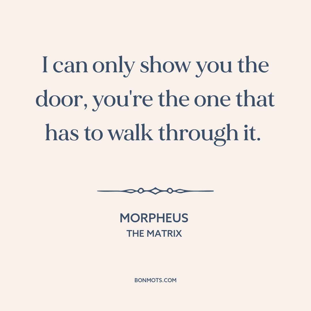 I can only show you the door, you're the one that has to walk through it. Morpheus The Matrix Watch The Matrix at Amazon Watch The Matrix at Amazon Instagram sharing coming soon. Quote text and source copied to clipboard. Link to this quote copied to clipboard. More information about this quote Topic Facing one's fears Leap of faith Taking risks Speaker Morpheus Actor Laurence Fishburne Source The Matrix Medium Film Genre Science fiction (film) Action (film) Science fiction Action Language English Time 1999 1990s 20th century Authentication Score 3 More information on Authentication Score coming soon. Citation The Matrix. Directed by The Wachowskis. Warner Bros./Village Roadshow Pictures/Groucho II Film Partnership/Silver Pictures, 1999. Citation text copied to clipboard.