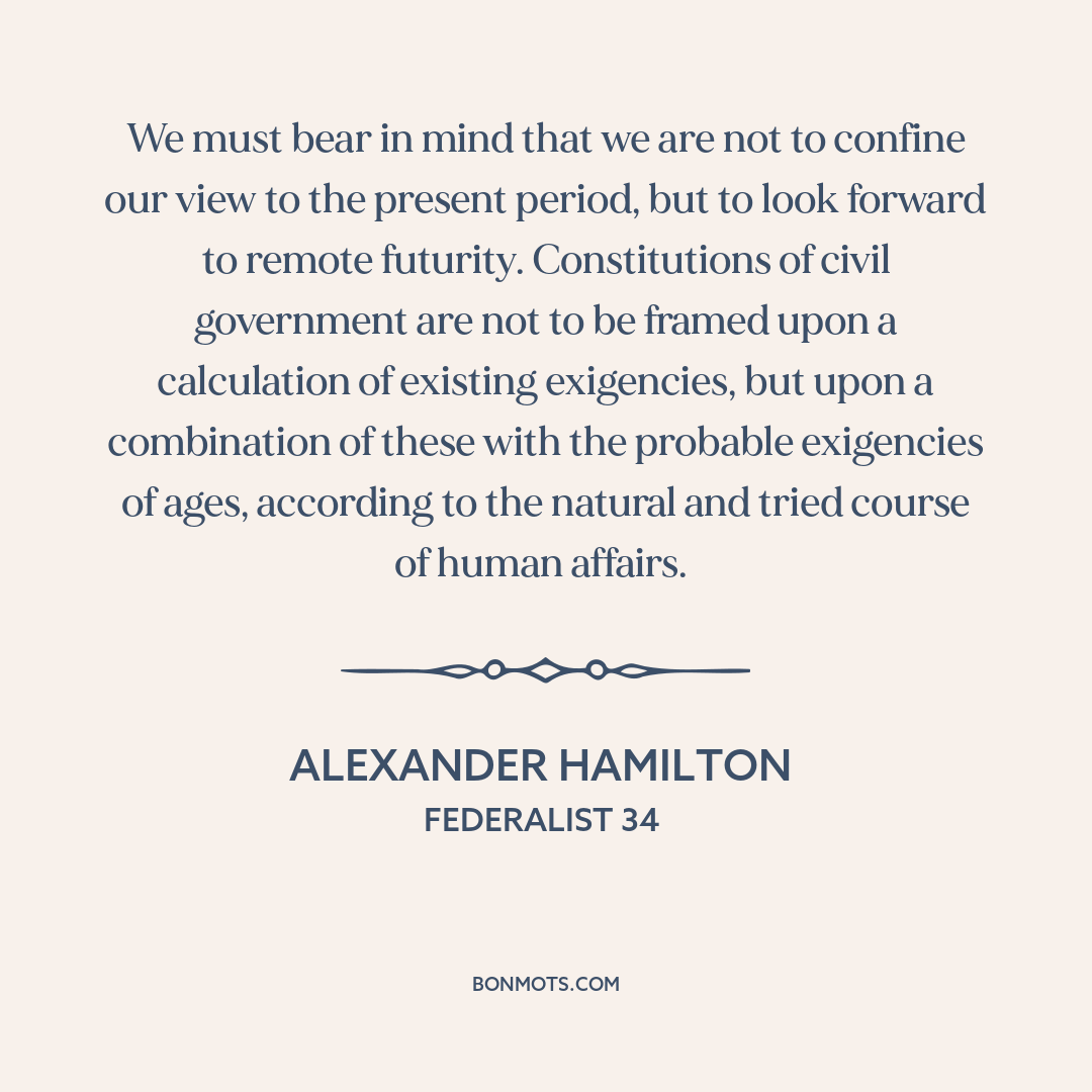 We must bear in mind that we are not to confine our view to the present period, but to look forward to remote futurity. Constitutions of civil government are not to be framed upon a calculation of existing exigencies, but upon a combination of these with the probable exigencies of ages, according to the natural and tried course of human affairs.