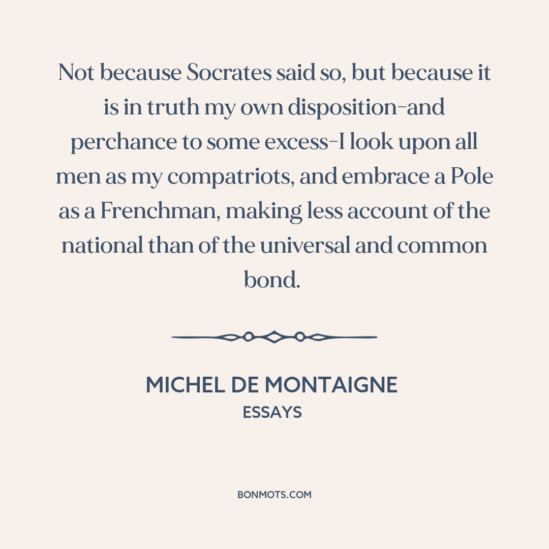 Not because Socrates said so, but because it is in truth my own disposition-and perchance to some excess-I look upon all men as my compatriots, and embrace a Pole as a Frenchman, making less account of the national than of the universal and common bond.